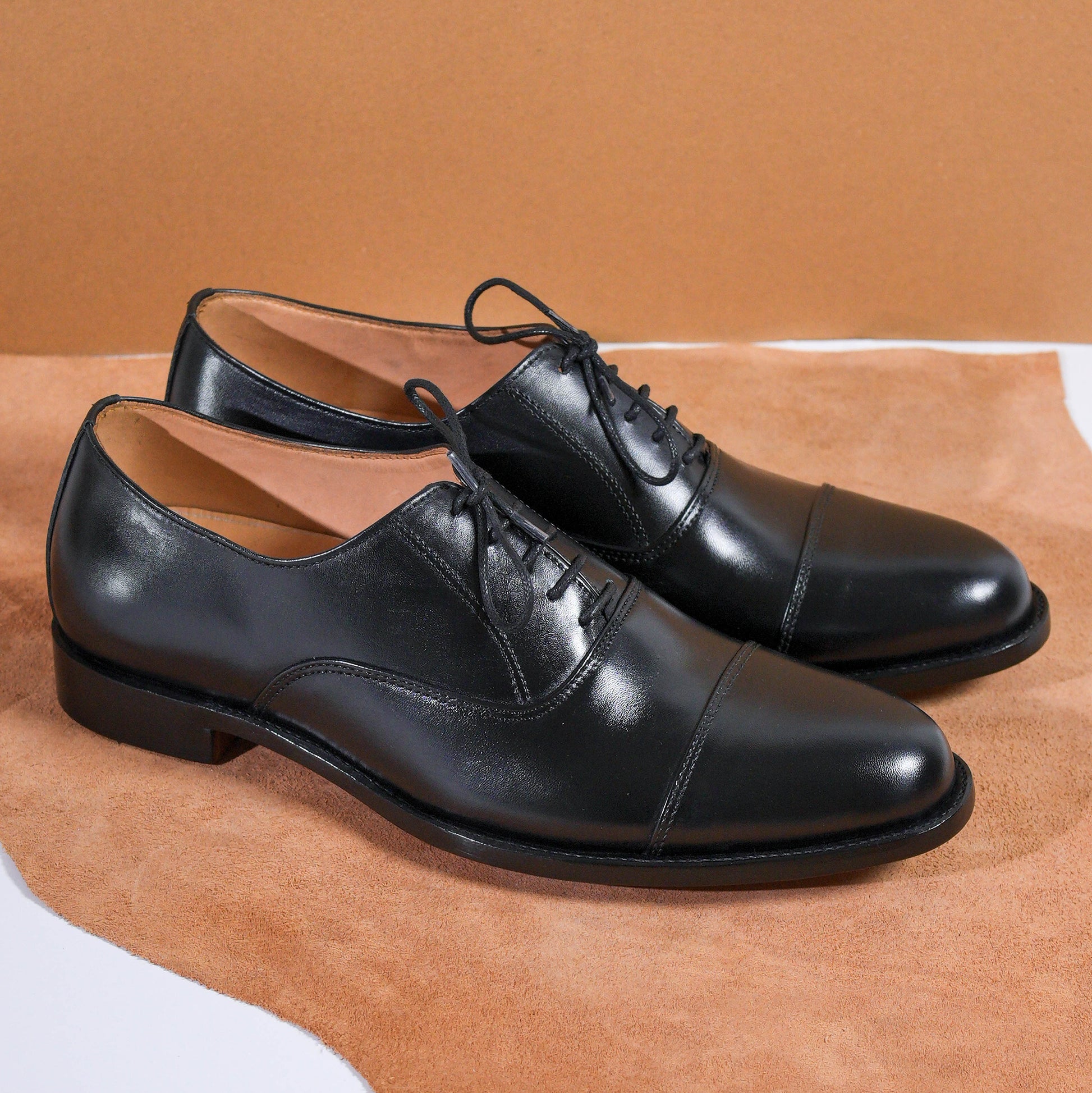 Crafted from premium calfskin leather, the Cyrus Noir features a sleek cap-toe silhouette defined by precision and refinement. Built with a double leather sole and Goodyear welt construction, it delivers exceptional durability, structure, and long-term comfort.