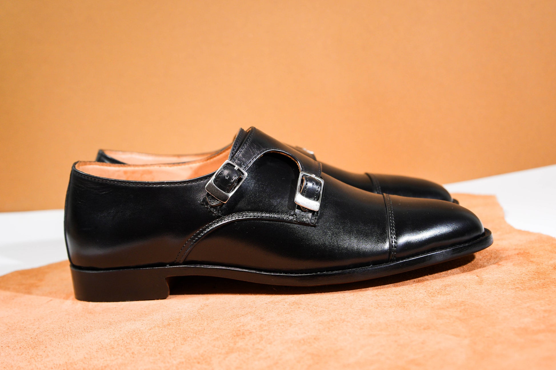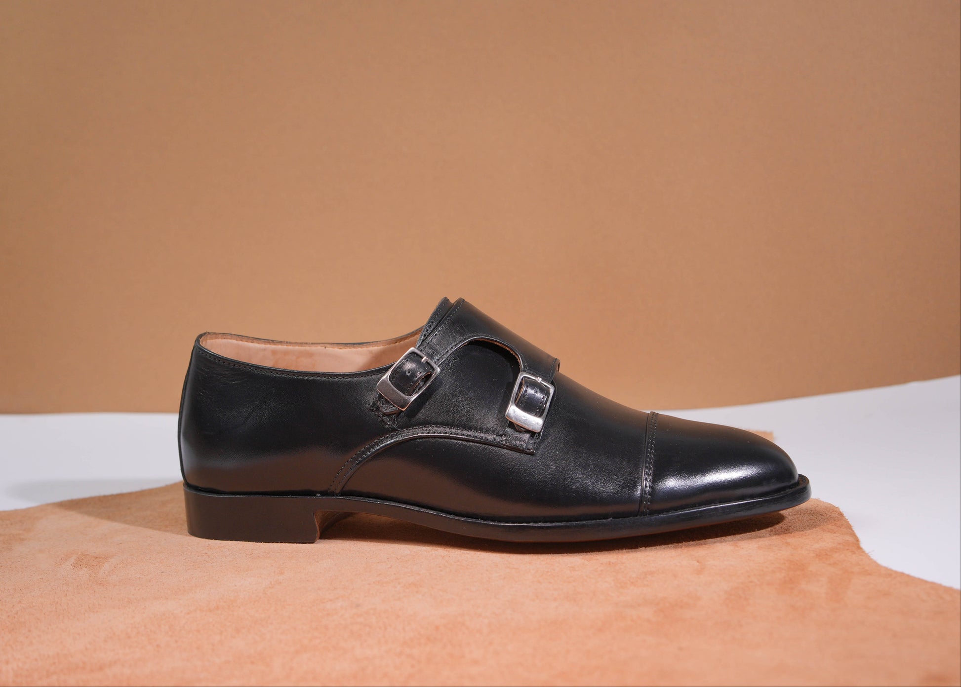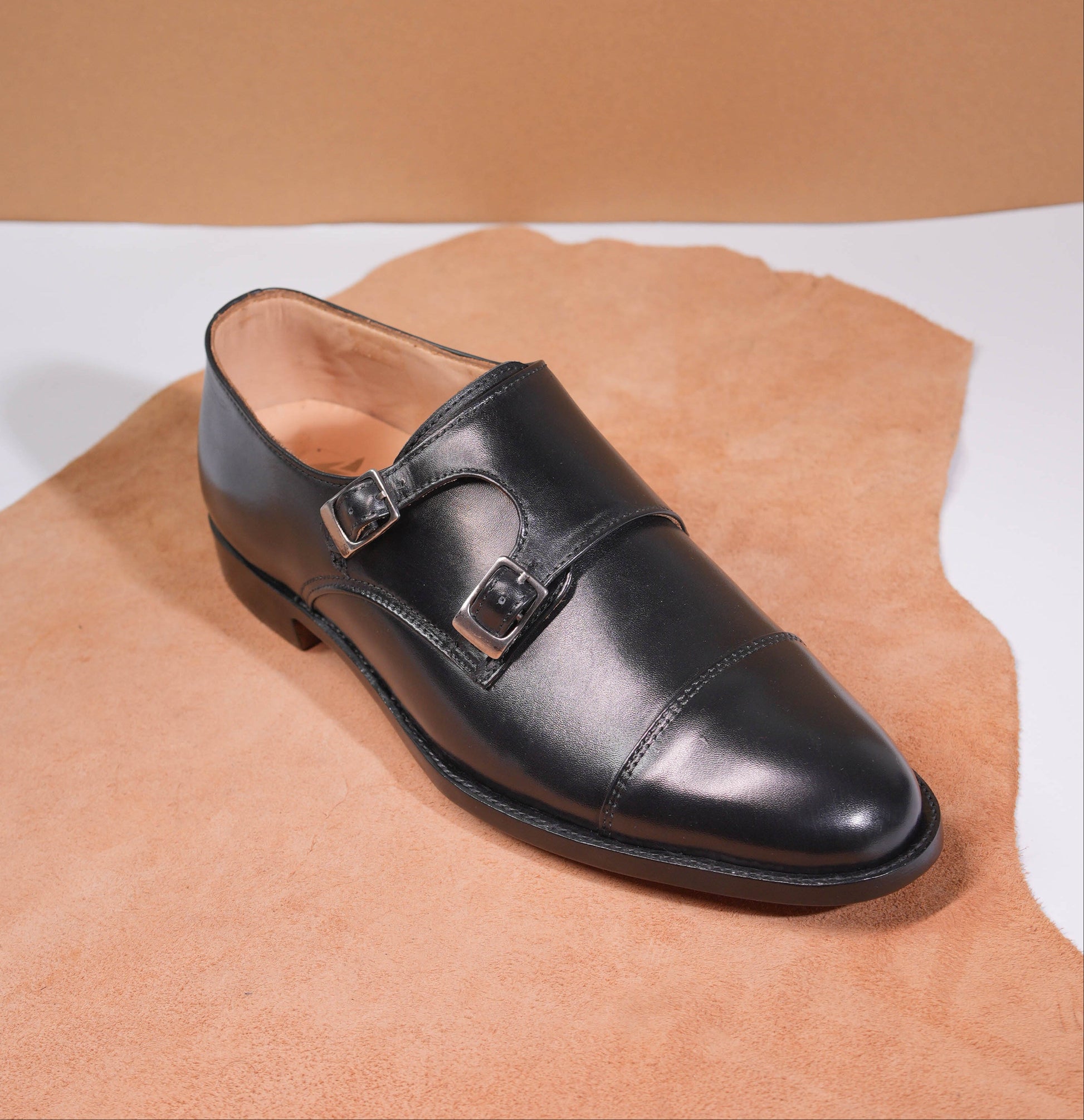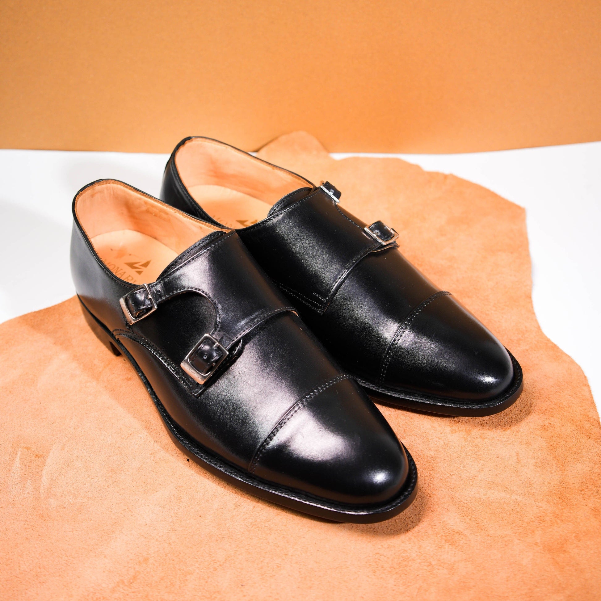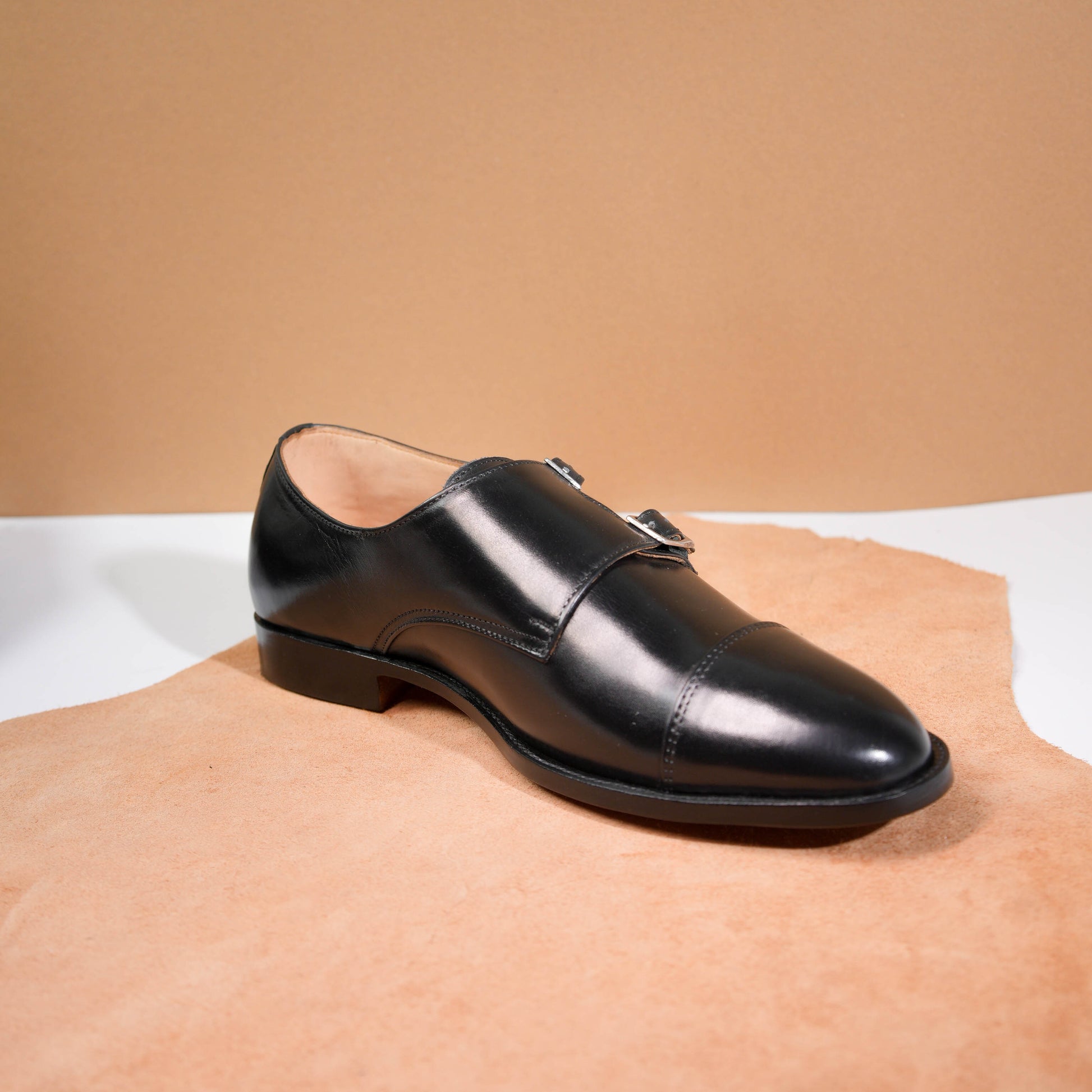 The Valerian Noir is crafted from premium calfskin leather, featuring a deep black finish that embodies confidence and refined elegance. Its distinctive double monk strap design, accented with sleek metal buckles, delivers a powerful statement while maintaining a clean, structured silhouette.